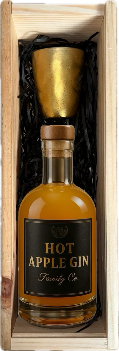 Warm, smooth and unmistakably festive — the Hot Apple Gin Gift Set is made for winter evenings. Our family recipe combines real apple, gentle winter spices and a soft gin finish, presented in a handmade wooden box with two enamel cups.
